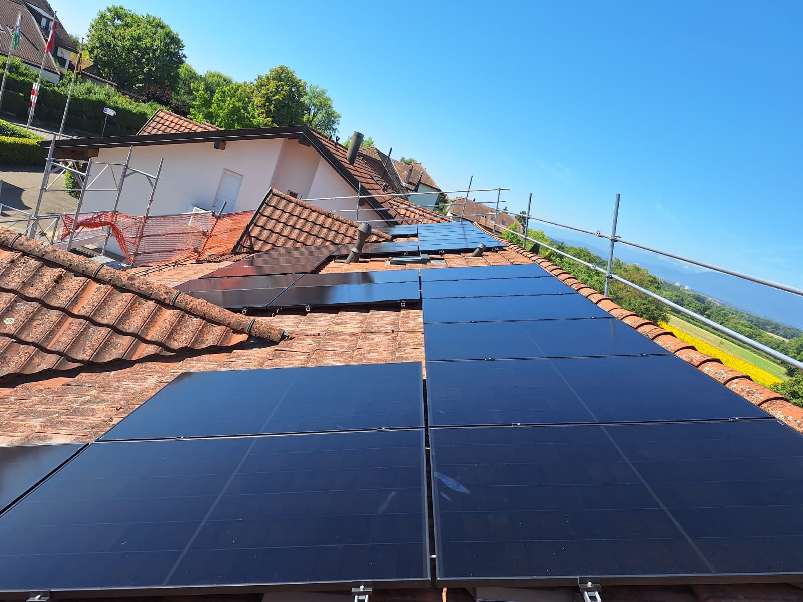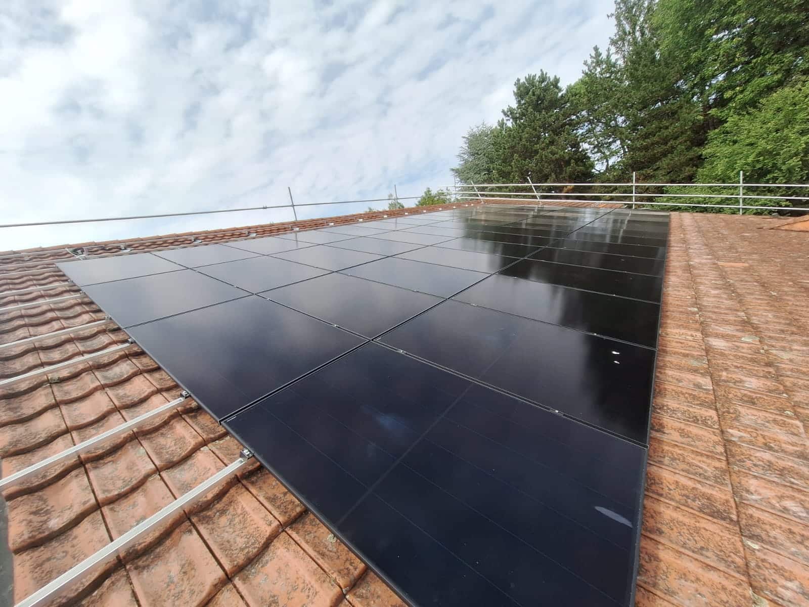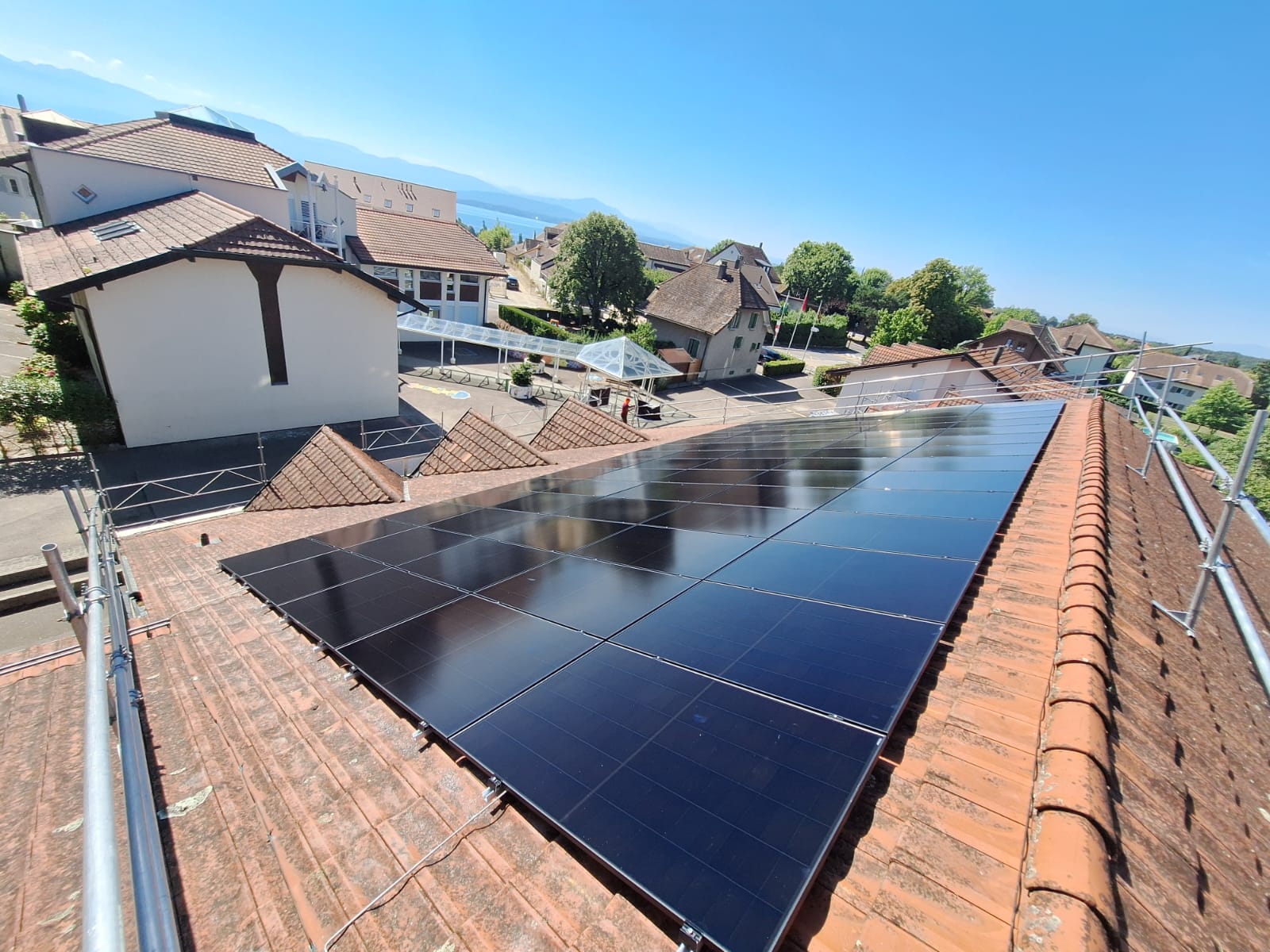 Les panneaux ont été intégrés de manière soignée sur la toiture inclinée, avec des passages de câble et des points de fixation traités proprement pour préserver l’étanchéité et l’esthétique du bâtiment. L’onduleur supervise la production en temps réel, permettant le suivi de la performance et une détection rapide des anomalies.