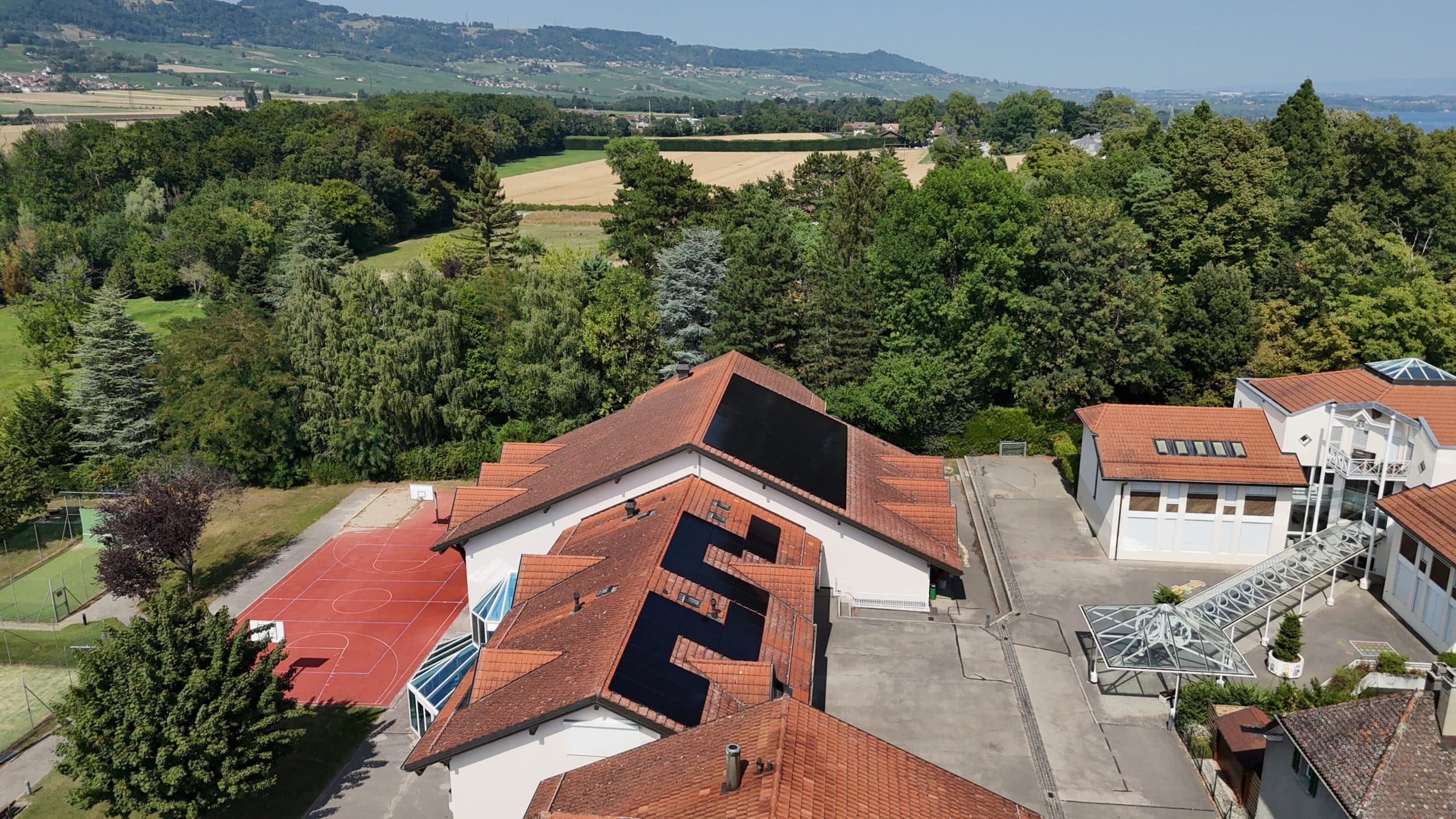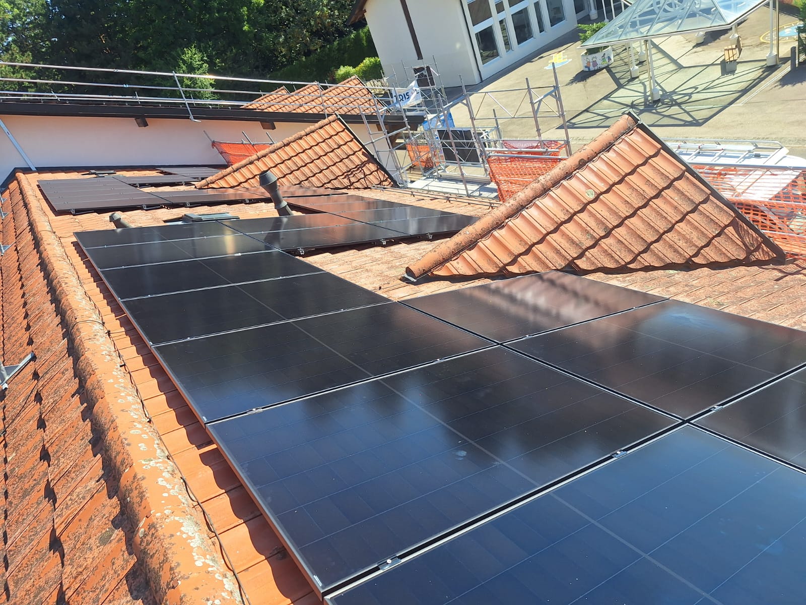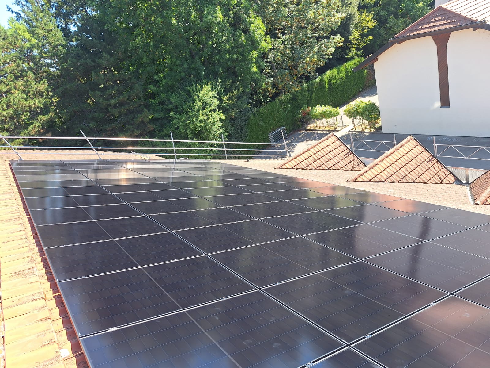 Les panneaux ont été intégrés de manière soignée sur la toiture inclinée, avec des passages de câble et des points de fixation traités proprement pour préserver l’étanchéité et l’esthétique du bâtiment. L’onduleur supervise la production en temps réel, permettant le suivi de la performance et une détection rapide des anomalies.